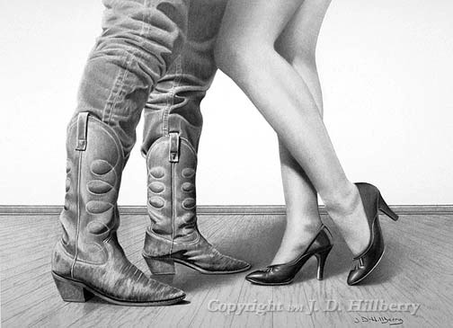 "Dance Floor Kiss" My brother and his wife modeled for me for this drawing. My original idea was to have them dancing. The problem was, my brother isnt much of a dancer. In all the reference photos I had taken to do this drawing he was standing flat footed. After looking at the photos, my wife decided it looked like he was curling her toes with a good kiss.